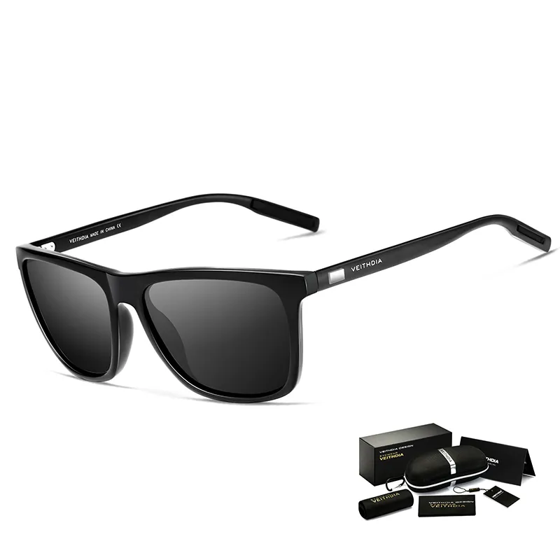 Black Frame + Black Temples + Gray Lenses Unisex Aluminum-Magnesium Square Polarized Sunglasses - Stylish UV-Protective Driving Glasses with Case