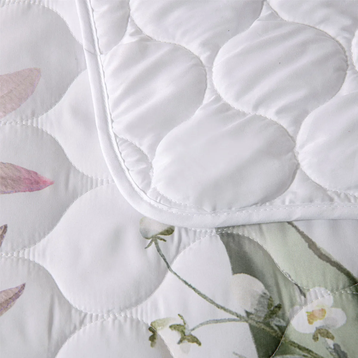 Lorna White Floral Printed Quilted Bedspread Set by Bianca encompasses stunning florals in soft pink, white, green, grey, and black hues, complemented by gorgeous green foliage which are perfectly placed across the bed. The classical quilting pattern adds depth to this beautiful design. Finished with a sophisticated cuffed edging in white gives this bedspread another level of class. Complete the look with matching accessories.