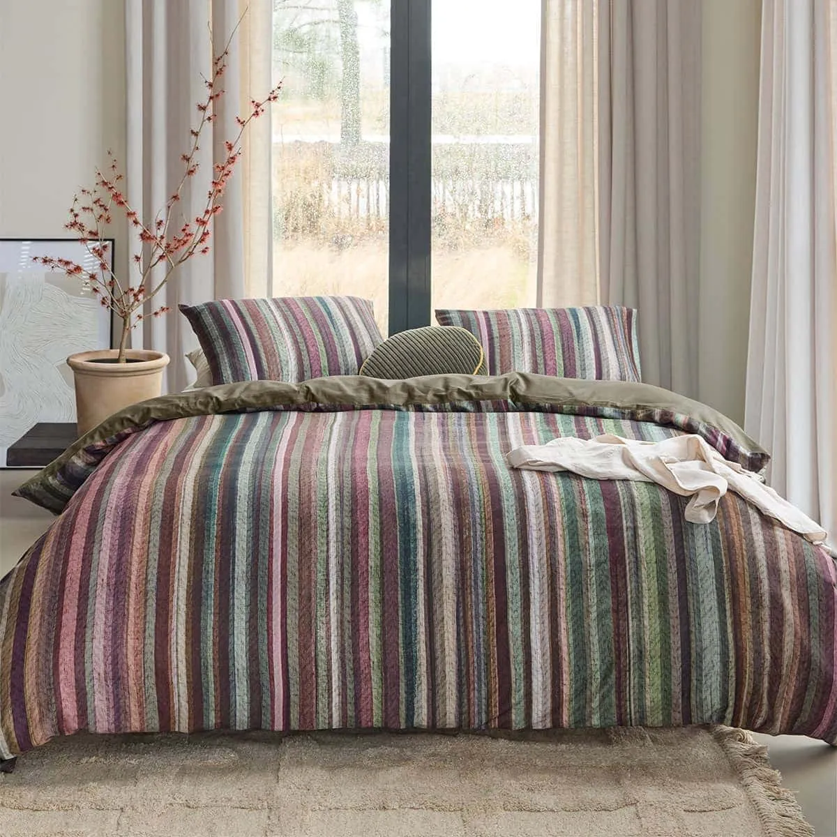 The Roman Multi Cotton Stripe Quilt Cover Set by Bedding House comprises a stunning stripe print in faded shades of pink, sage, white, burgundy, grey, purple, and taupe. The vertical stripes are painted with watercolours, creating lots of colour nuances and overlays. The duvet cover background has a woollen fabric texture. The backside of the duvet cover is uni-dyed olive green. The duvet cover's satin weave feels delightfully soft to the touch and has a sophisticated sheen.