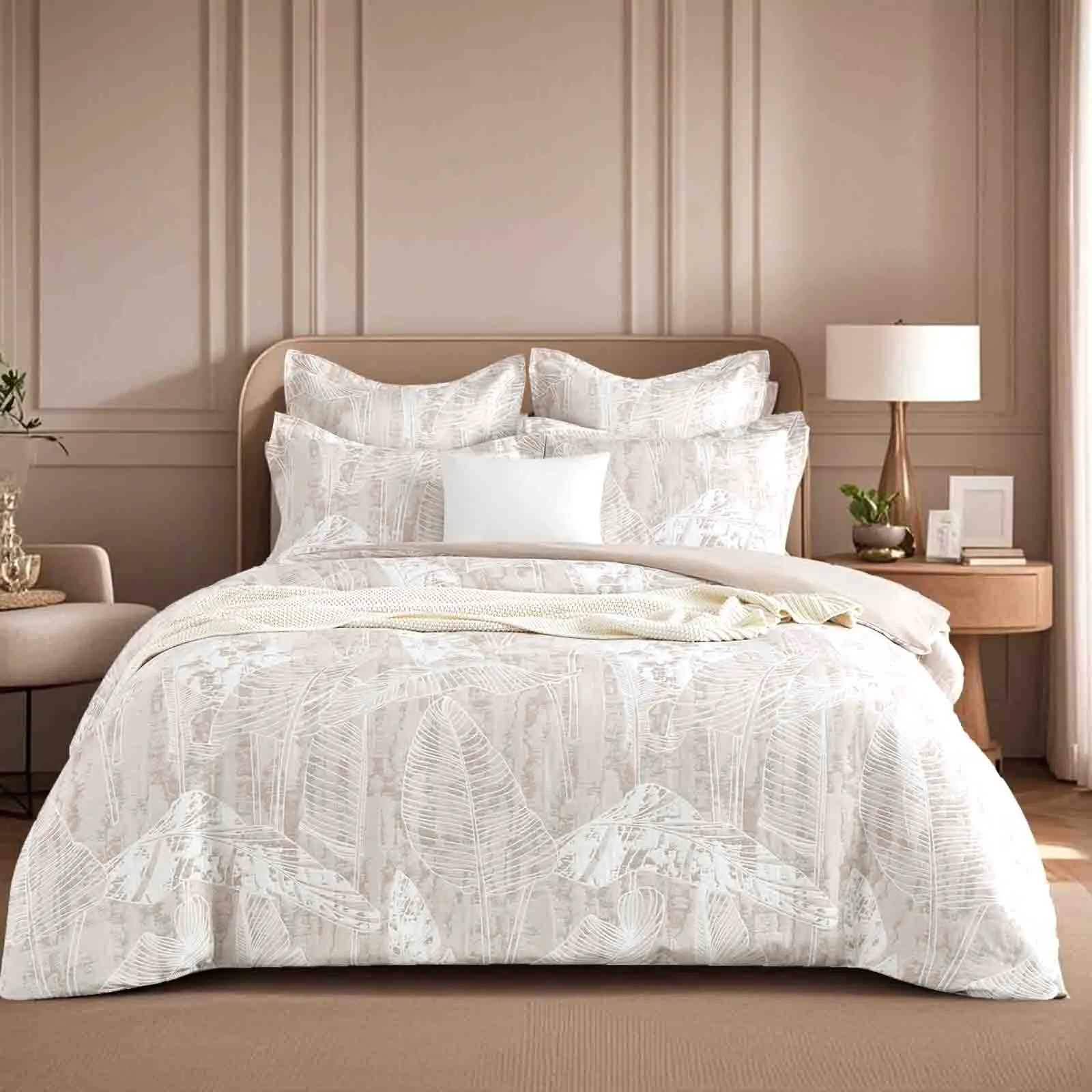 Renee Taylor Panache Jacquard Quilt Cover Set WoodOur Panache quilt cover set can transform your bedroom into a serene retreat with our elegant quilt cover set. Featuring a subtle botanical pattern in a soothing neutral palette of Beige & soft white, this design effortlessly complements any decor style. Crafted from premium cotton blend woven jacquard, it offers a luxurious texture & breathability for year-round comfort. Elevate your bedding experience with timeless sophistication & cozy softness. Perfect for adding texture & depth to your bedding while keeping the aesthetic clean & inviting.Features:? Luxuriously soft and naturally breathable for a restful sleep.? The woven design adds depth and style without the need for busy prints.? Complements any bedroom d?cor effortlessly.? It's also OEKO TEX certified which means no nasty chemicals.? Matching European Pillowcase available (sold separately).Size | Set Includes:? Double - 1 x quilt cover - 180 x 210 cms / 2 x pillowcase - 48 x 74 + 16 cms flap? Queen - 1 x quilt cover - 210 x 210 cms / 2 x pillowcase - 48 x 74 + 16 cms flap? King - 1 x quilt cover - 245 x 210 cms / 2 x pillowcase - 48 x 74 + 16 cms flap? Super King - 1 x quilt cover - 270 x 240 cms + 5 cms flange / 2 x pillowcases - 48 x 74 + 16 cms flange? European P/Case - 65 x 65 Cms + 5cm Flange. Sold separately.Product images are only visual representations, and while care is taken to ensure accuracy, colours may vary due to monitor variations.Wash Care Instructions:Front: Cotton PolyReverse: 100% CottonWash separately before first useCold gentle machine washDo not use hot waterWash with similar coloursDo not soak. Do not bleachRinse well. Normal spinMay be tumble dried cool or line dry in shadeWarm iron if requiredDo not dry clean (X)