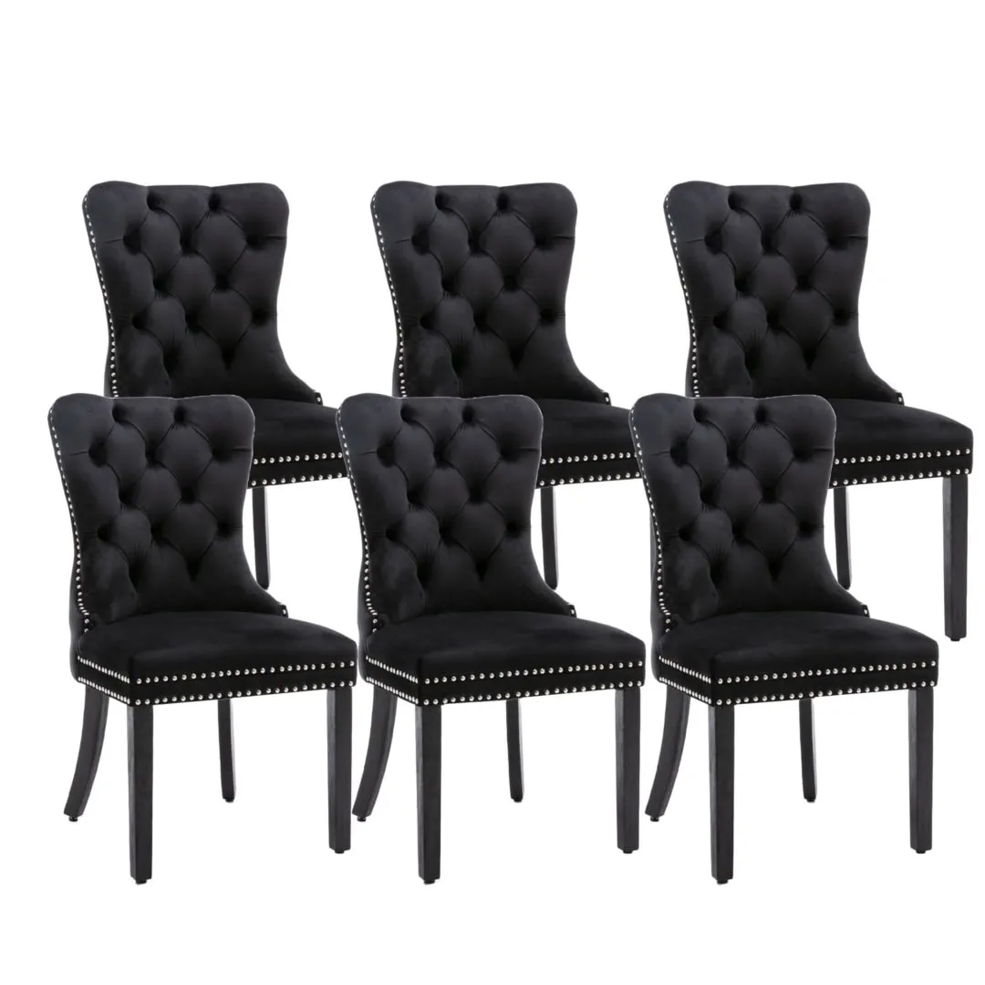 6x Velvet Dining Chairs Upholstered Tufted Kithcen Chair with Solid Wood Legs Stud Trim and Ring-Black