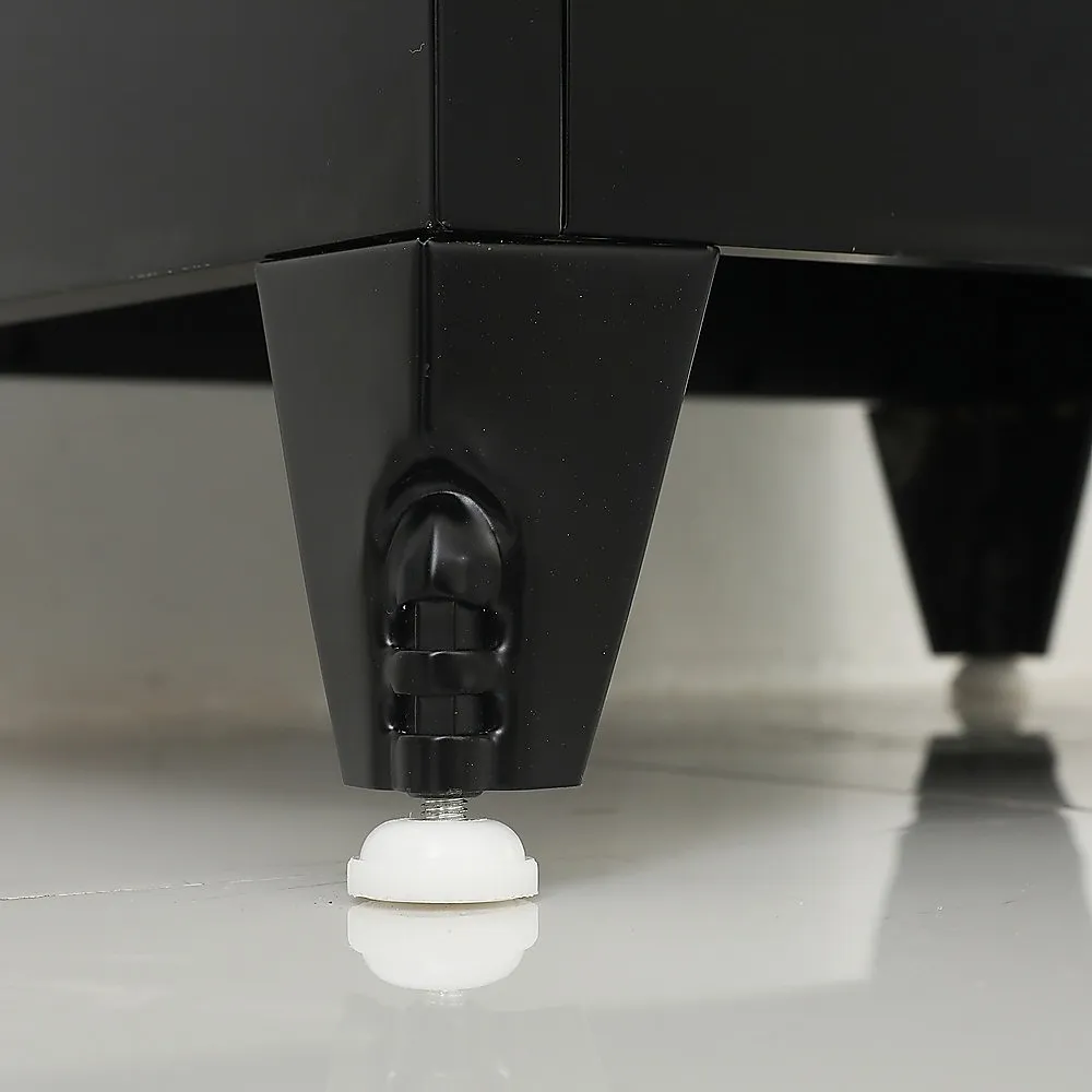 The steel material has a thickness of 0.6mm. The bottom panel is designed with side and central reinforcement, hidden metal hinges and galvanized screws. It has a concealed security lock and adjustable legs for greater stability.