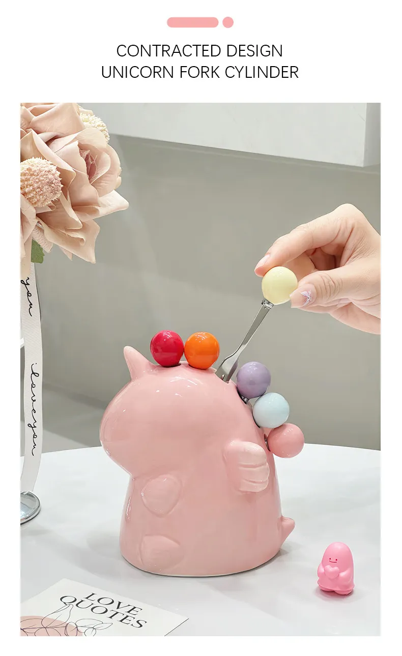 Add a sprinkle of magic to your dining table or dessert spread with our Adorable Unicorn Ceramic Fruit Fork Holder Set. This charming set features a cute unicorn-shaped ceramic barrel designed to hold stainless steel fruit forks. The forks themselves are topped with colorful, round ceramic balls, making them easy to grip and delightful to use. The unicorn holder offers convenient and tidy open-access storage for the forks, enhancing home aesthetics and bringing a sense of everyday ritual to your fruit enjoyment. Perfect for parties, daily use, or as a unique decorative piece, this exquisite all-in-one set is both practical and enchanting. The stainless steel forks are designed to be smooth and gentle on the tongue.