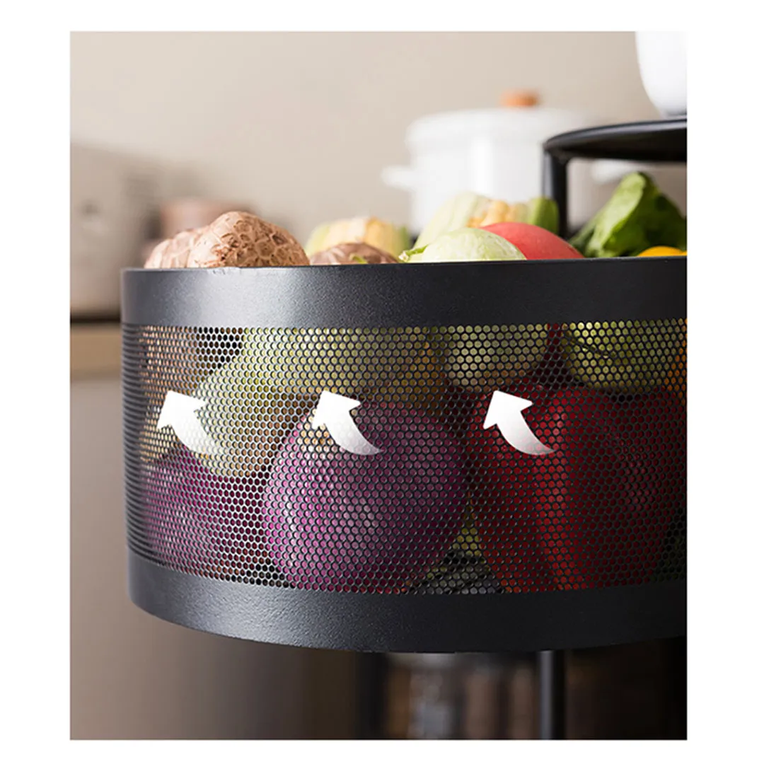 - With ROTATING BASKET DESIGN, that can be rotated left and right, placing and taking items more convenient and direct. The basket breathable pattern design ensures ventilation (keeps fruits and vegetables fresh), while you can place a thing on top of the shelf.