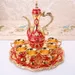 Crafted from durable zinc alloy with intricate details, this set includes a decorative decanter (ewer), six matching goblets, and a coordinating serving tray. The combination of polished gold plating and vibrant enamel accents creates a look of timeless luxury.