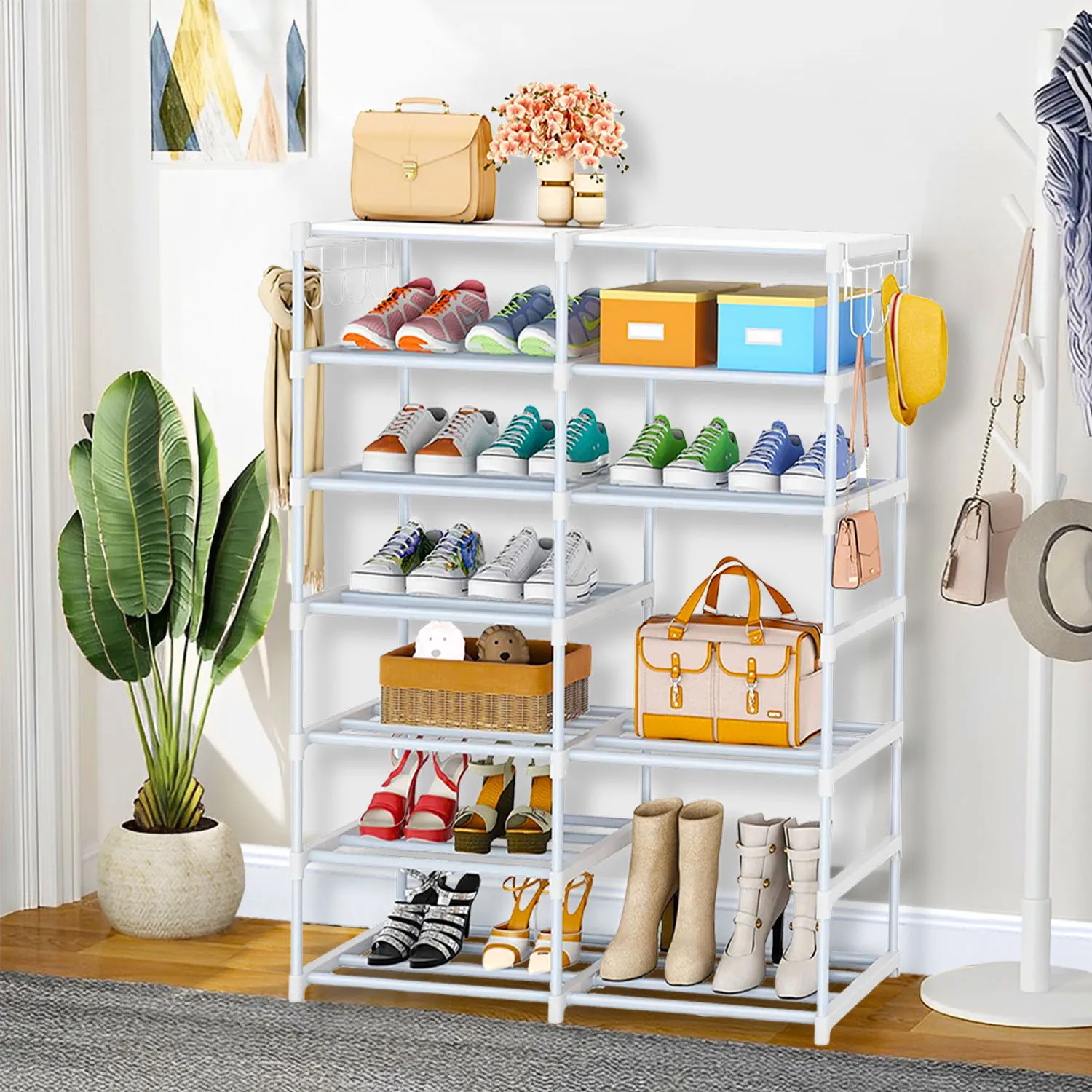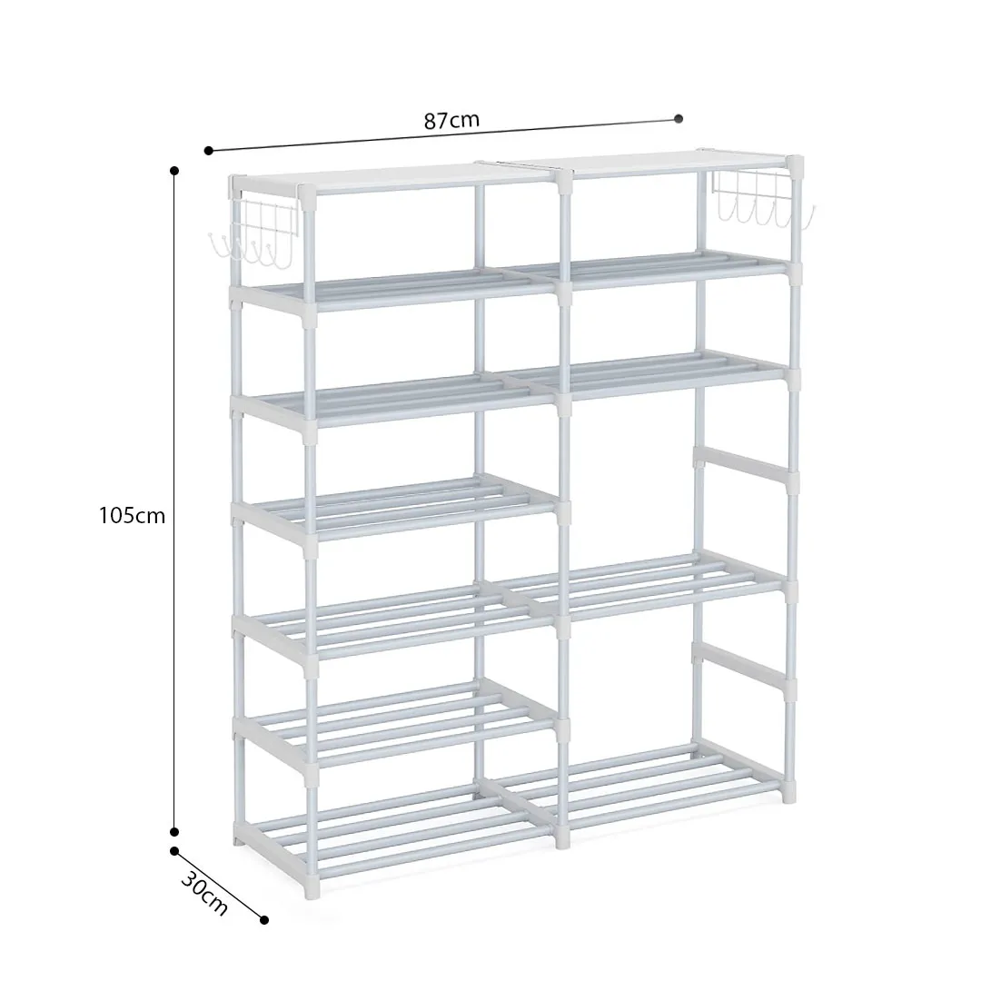 SOGA 12-Shelf Tier Shoe Storage Shelf Space-Saving Caddy Rack Organiser with Side Hooks White