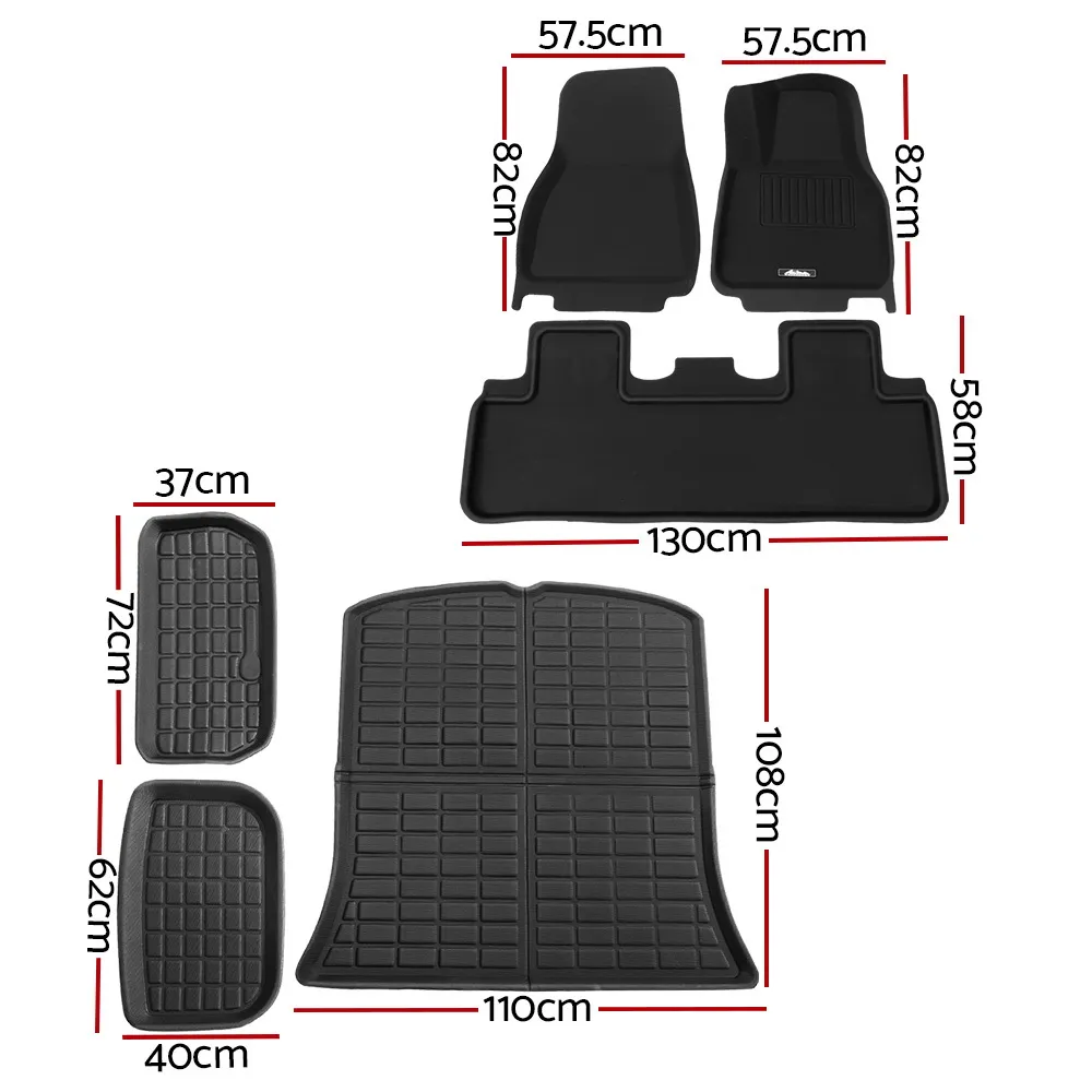 _product_id: 373644Protect your car from dust and other debris with our rubber car mats. This set comes with six car mats front floor mats, rear floor mat, front trunk mat, rear cargo mat, and rear trunk toolbox mat. It's designed to protect your floors and keep your car's carpeted cargo area clean. The car mat set is compatible for Tesla Model-Y. It's crafted from quality thermoplastic top material, which makes it durable and longlasting. Additionally, it's foldable and flexible, made from 100% recyclable material, and comes with one year warranty. For a better fit, the car mat is custom moulded and laser cut. It has high edges that offers complete protection along the sides. So you don't have to worry about dust particles accumulating in the corners and edges. Furthermore, the car mat has non-slip backing and offers great resistance to changing weather conditions, water, scratch, oil, and other chemicals. Convenient and practical, it can be easily cleaned with water and detergent to keep it looking desirable. It's also odour-free, which makes it perfect for those who are at risk of developing allergies. Purchase this efficient and reliable rubber car mat today for your vehicle.
