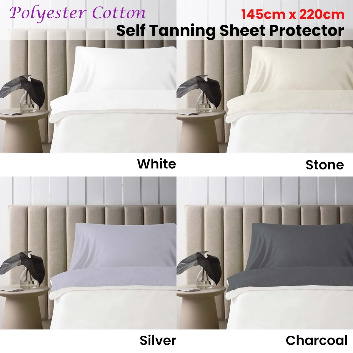 _product_id: 454487Worried about staining your sheets after fake tanning? Up your game and play it safe with the Self Tanning Polyester Cotton Sheet Protector 145cm x 220cm by Accessorize. Lay the protector on your bed over your existing fitted sheet and pop your pillow inside the built-in pillow slip, fold the top of the protector over your body to prevent staining of your quilt cover. Our Self-Tanning sheet protectors are the perfect addition to your tanning routine. Please wait 15-20 minutes or until your tan is dry before getting into your protector. Machine washable and made from Cotton/Polyester.